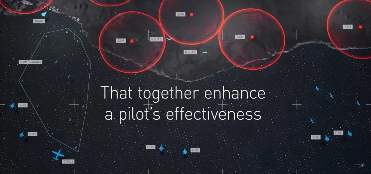 The presentation depicts various large and small drones, high-end and attritable, with different roles controlled by a single fighter and integrated into a more comprehensive network of air assets operating in a contested battlespace.