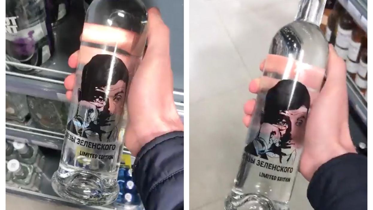 The seven-second clip shows a man picking up a bottle of vodka with a black-and-white image of Ukrainian President Volodymyr Zelensky wiping a tear from his right eye and “Zelensky’s Tears” written below in Russian, followed by “limited edition” below in English.