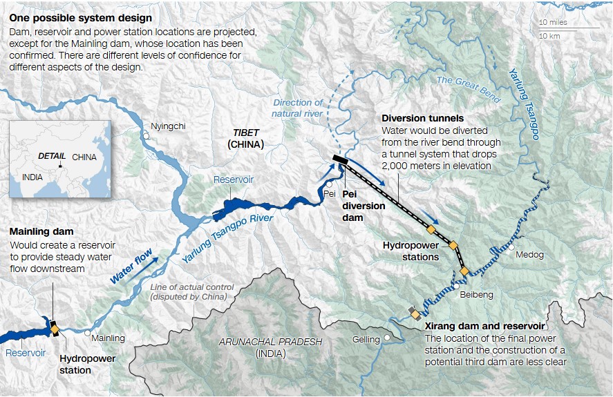“Clues about the project’s design, both referenced in official or scientific reports and from open-source information… suggest a complex system that could include dams and reservoirs along the Yarlung Tsangpo river, as well as a series of underground hydropower stations connected by tunnels, harnessing energy as a diverted portion of the river makes a steep elevation decline.”