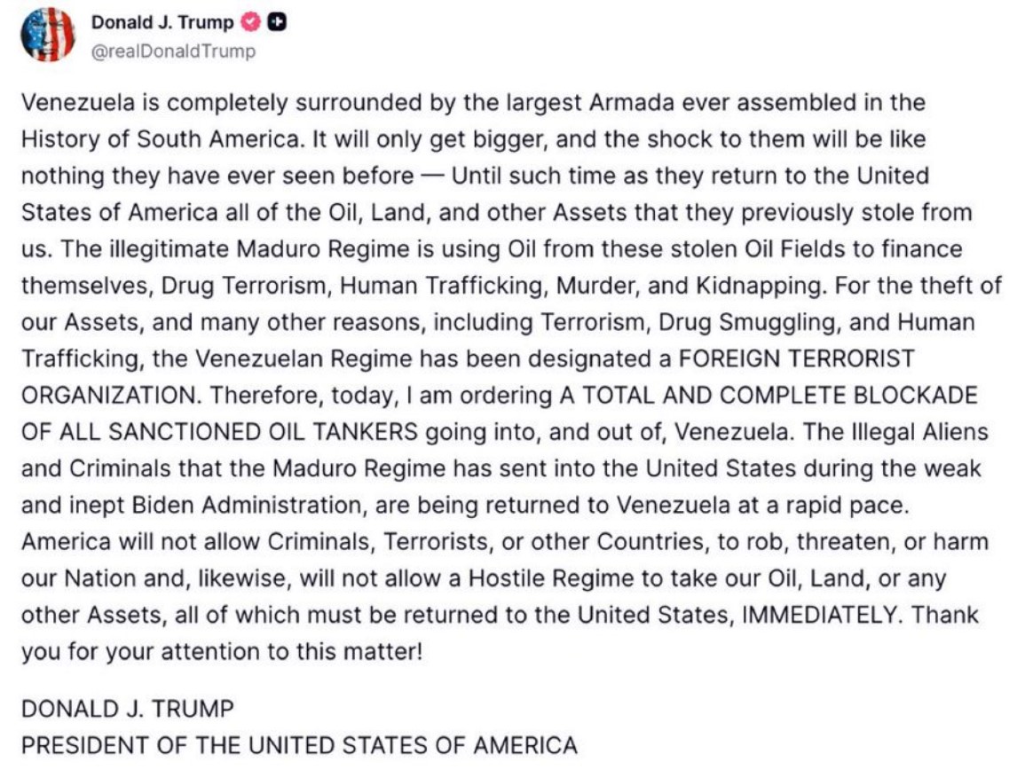 “Therefore, today, I am ordering A TOTAL AND COMPLETE BLOCKADE OF ALL SANCTIONED OIL TANKERS going into, and out of, Venezuela.”