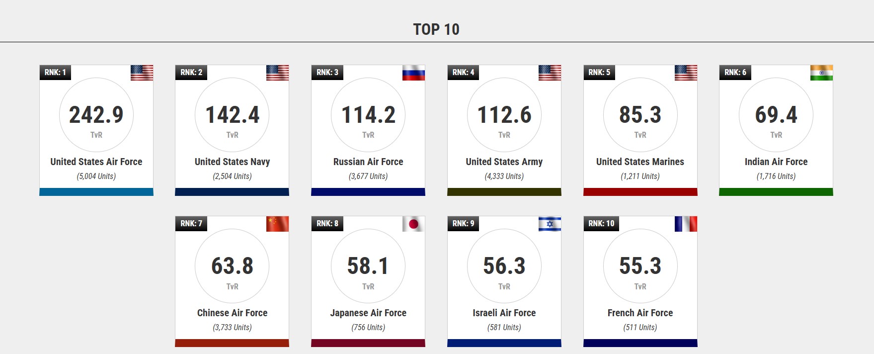 “The WDMMA annual ranking utilizes a formula which takes into account values related to total fighting strength of the various air services of the world. The formula produces the ‘TruVal Rating’ (TVR), helping to definitively separate each power based on – not only overall strength – but modernization, logistical support, attack and defense capabilities, and so on,” says WDMMA, explaining its ranking rationale.