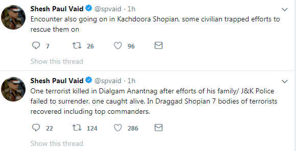 In a tweet, DGP Vaid said: Seven bodies of Kashmiri Militants have been recovered from the site of a gunfight with the Indian Army. He said the slain included top commanders.