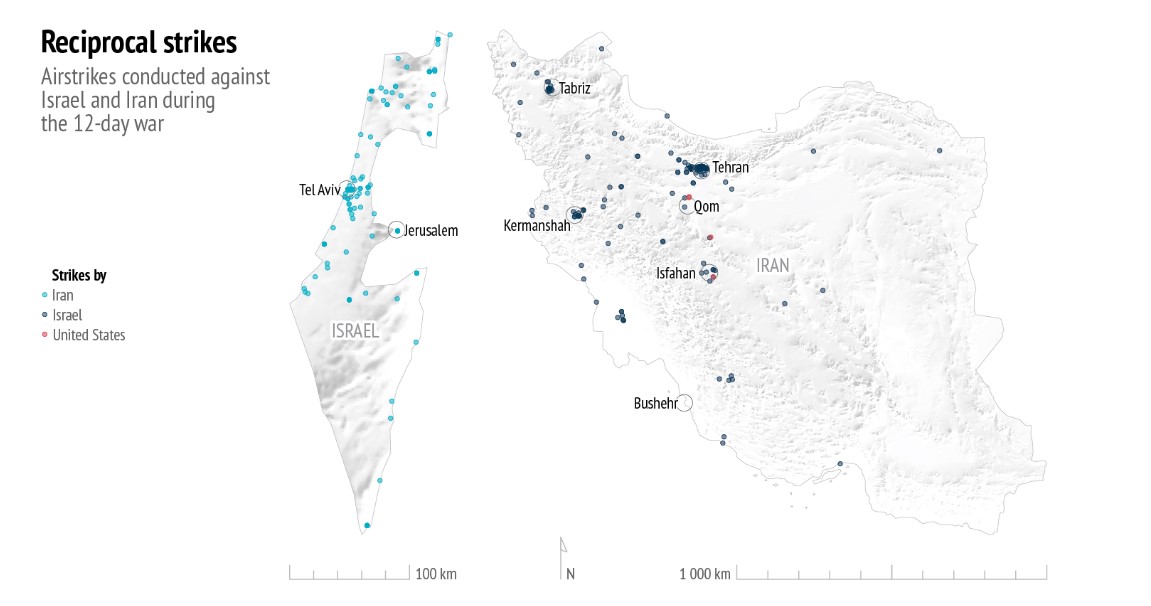 A map of reciprocal strikes by Iran and Israel during the 12-day war. Credits European Union Institute for Security Studies (EUSS).