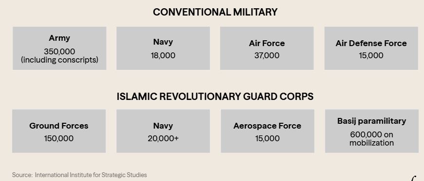 The Iran-Iraq War transformed the IRGC into a more conventional fighting force, with a command structure similar to that of Western militaries. Now highly institutionalized, it remains a force parallel to Iran’s regular armed forces, with upwards of 190,000 troops under its command, according to the International Institute for Strategic Studies (IISS).