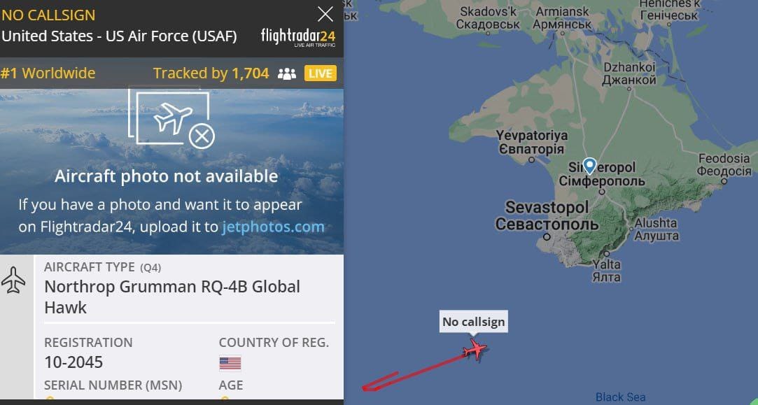 A US RQ-4B Global Hawk UAV (tail number 10-2045) was reportedly spotted in the Black Sea, south of Crimea, for reconnaissance, data from a live flight tracking website confirmed.