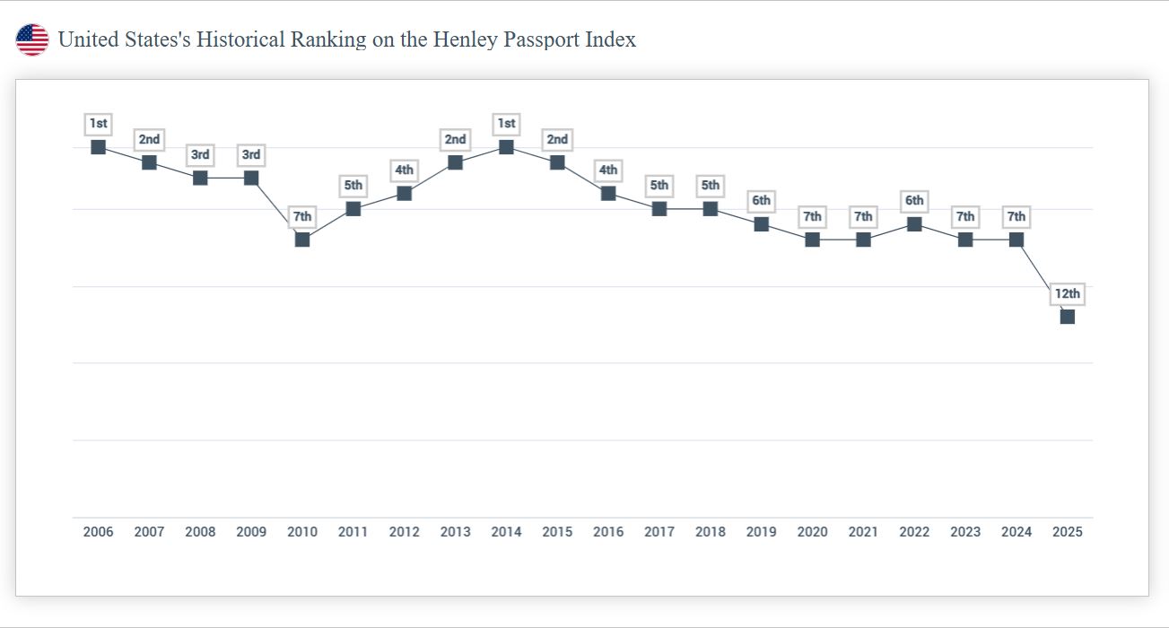 This is the first time in the two-decade history of the Henley Passport Index that the US passport has fallen out of the top 10 altogether.