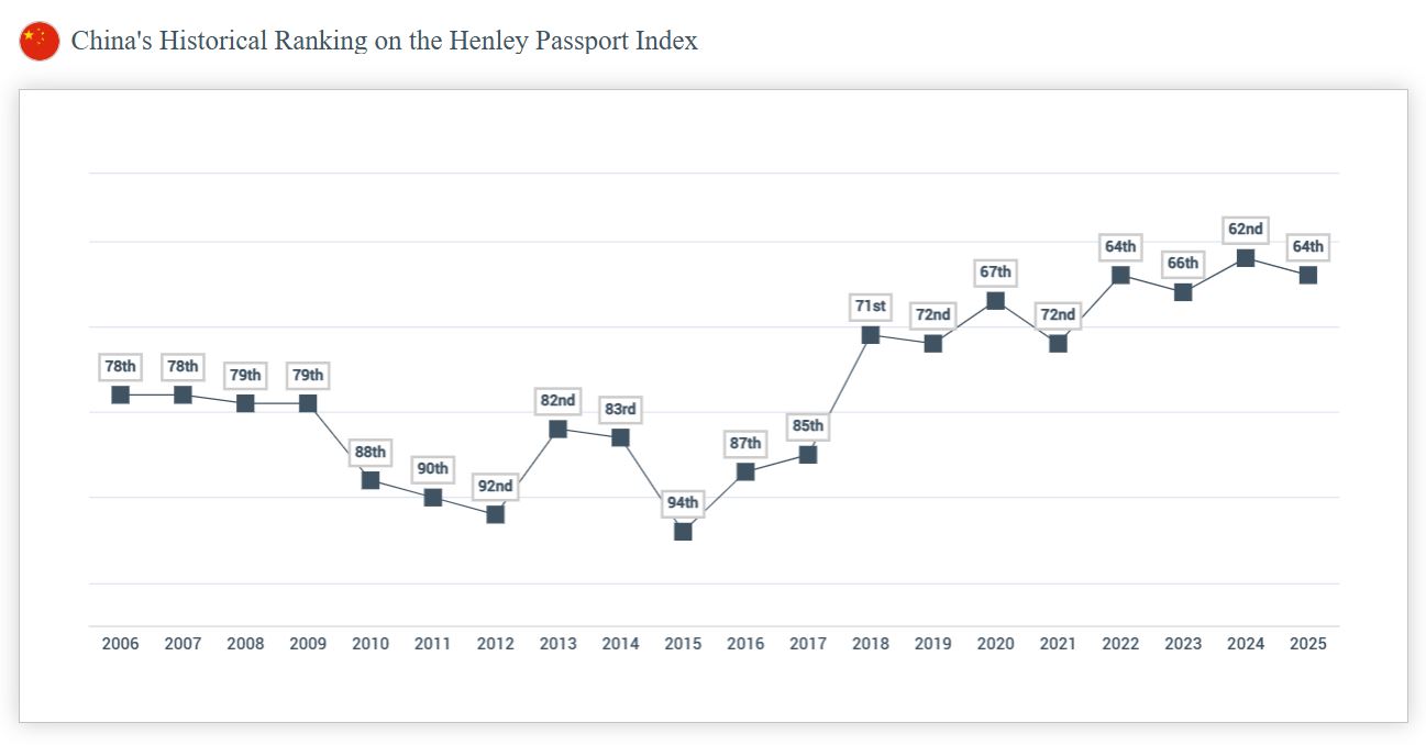 China has been among the biggest climbers on the Henley Passport Index over the past decade, leaping from 94th place in 2015 to 64th in 2025, with its visa-free access score increasing by 37 destinations during that time.