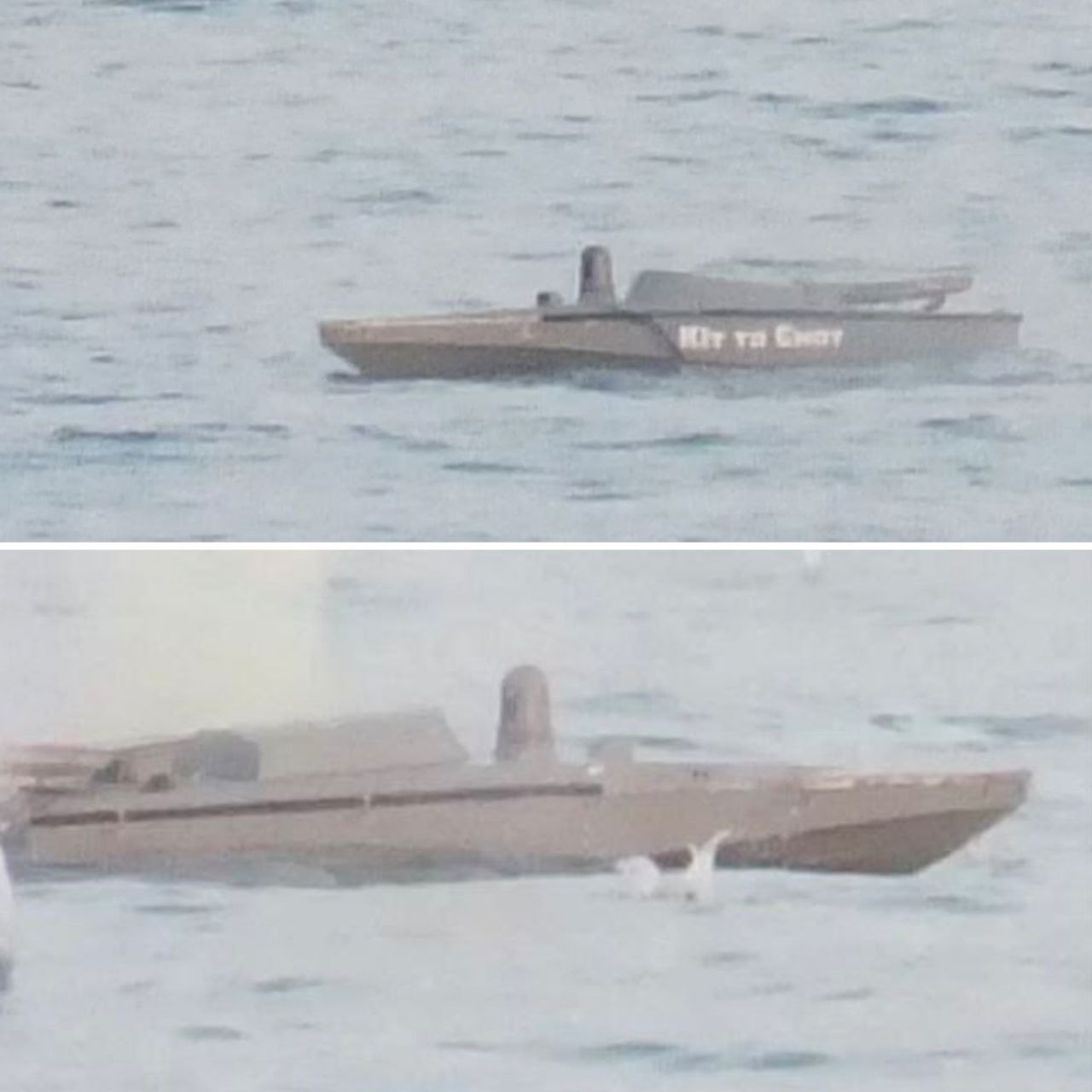 This USV has been identified as ‘Cat and Racoon’ by the Russian Ministry of Defense (RuMoD), based on the Cyrillic letters printed on its left side.