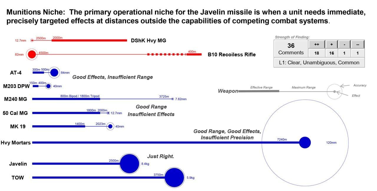 One chart shows the actual performing range of the Javelin with an 8.4-kilogram missile at 2,500 meters (2.5 kilometers), half of the advertised five kilometers distance. The graph relevant to the Javelin is called “just right” and also records the observed ranges of other systems like the TOW missile, AT-4 rocket launcher, and heavy mortars.