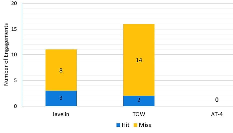 Another set of graphs compared the Javelin’s hit ratio to the TOW missile’s, where the former hit only three targets out of 8 “engagements” while the latter hit 2 out of 14. However, the conditions of these engagements – whether in exercises, combat scenarios, weather conditions, test conditions, or on moving or stationary targets – are unknown.