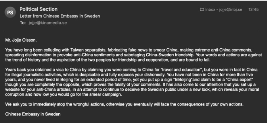 A month ago, OIsson launched a new website Kinamedia which claims to be Sweden’s largest news website focussed on China. His sympathy towards the Taiwanese side led to the Chinese embassy in Sweden sending him a fourth and “most confrontational” email yet on April 9.